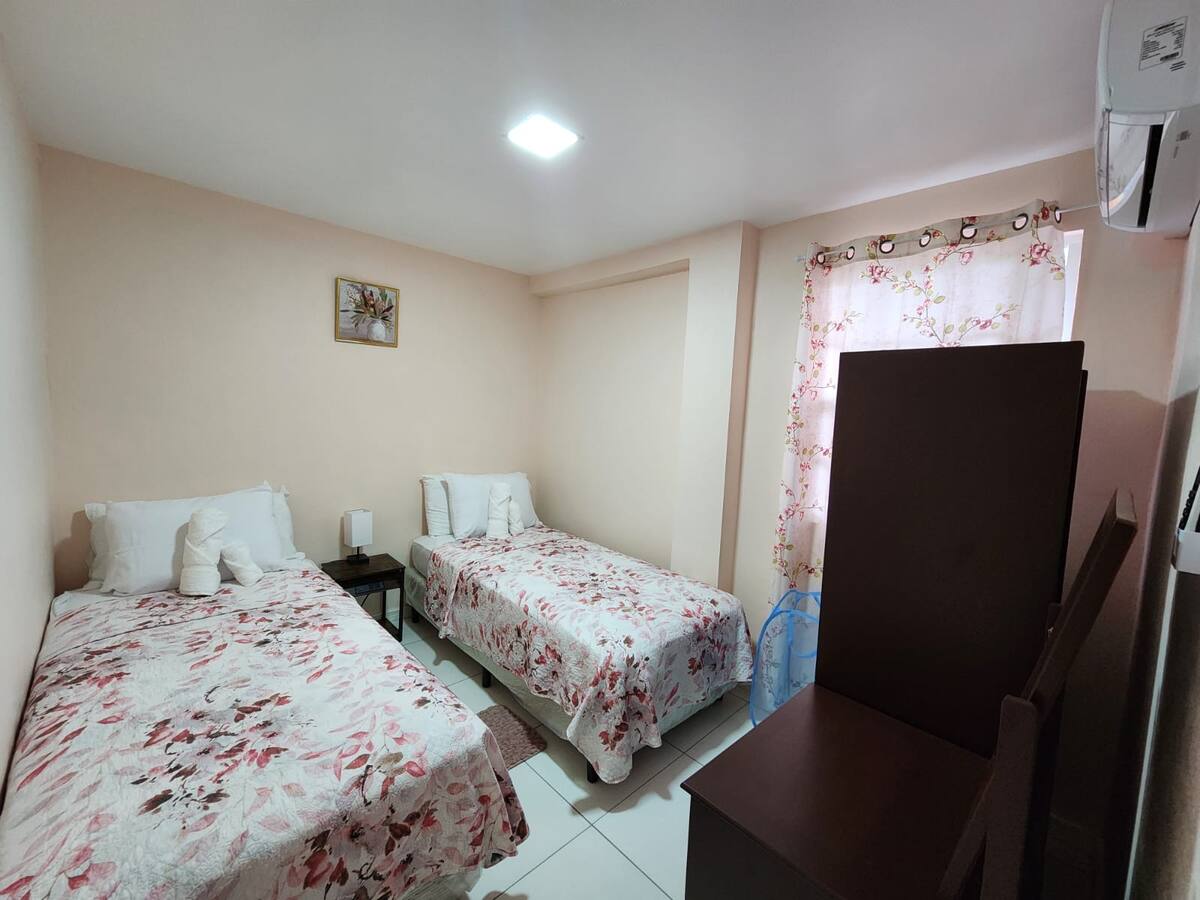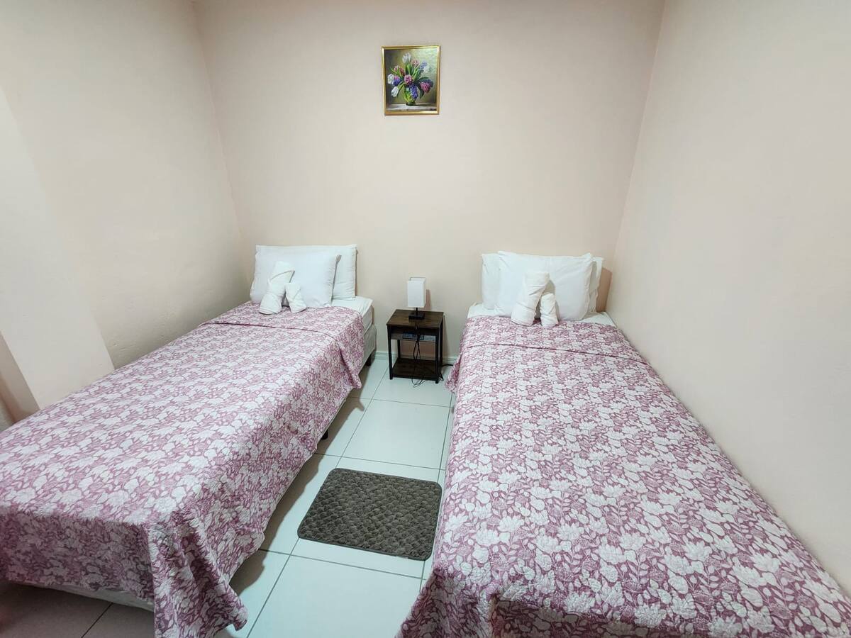 The 1st floor has 2 apartments. One apartment has 2 bedrooms with 4 single beds, 1 bathroom and 1 kitchenette/living room. The other apartment has 2 bedrooms with 2 single beds, 1 bathroom and 1 kitchenette/living room.